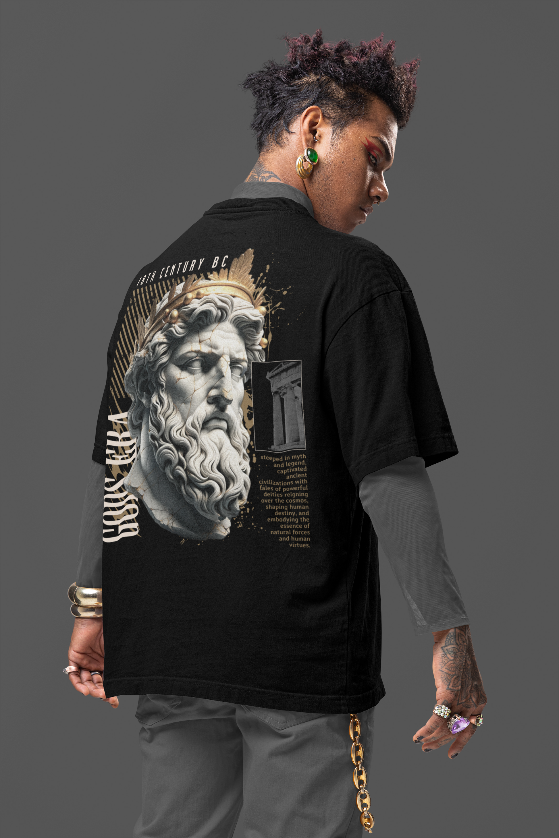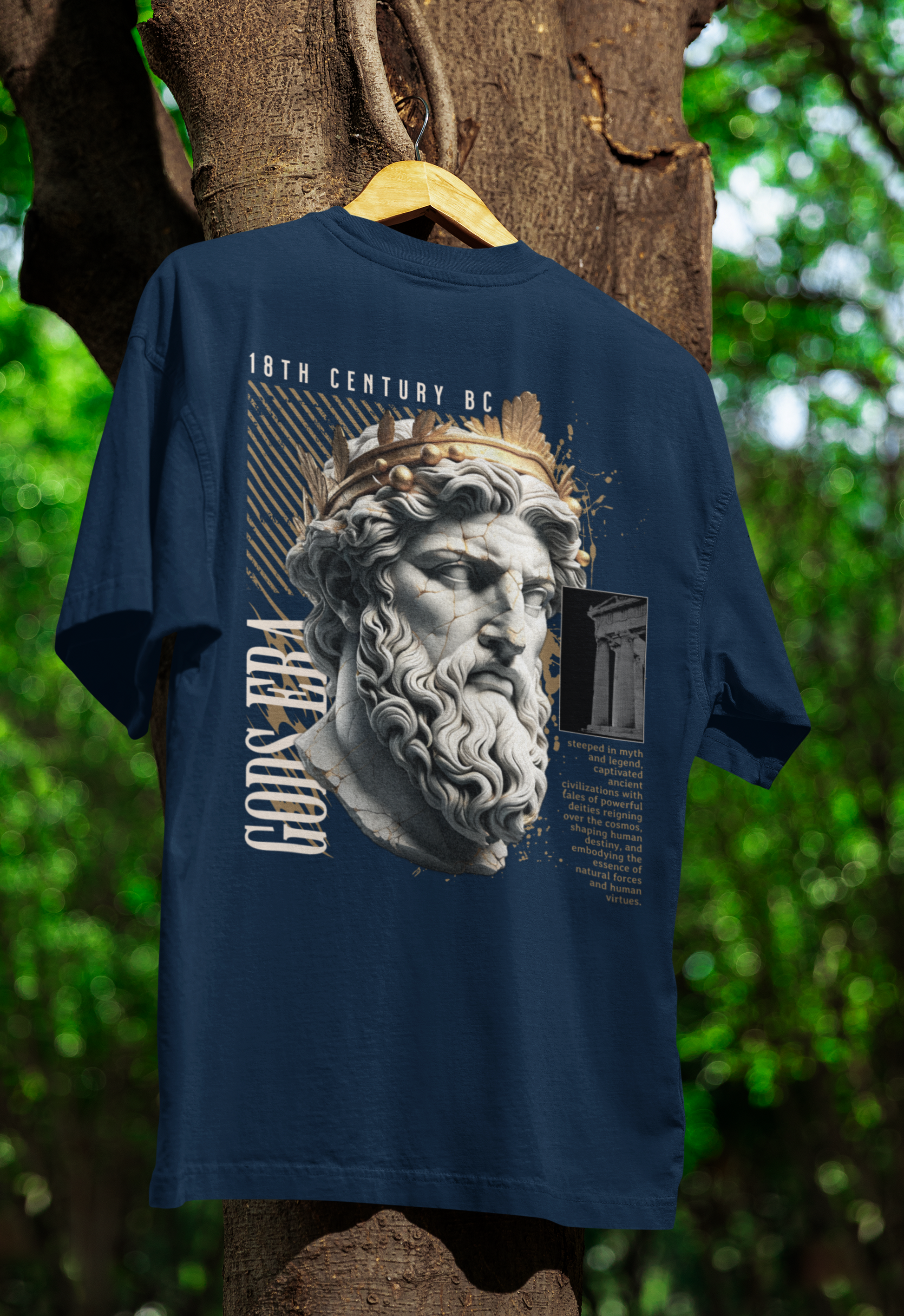 Back print: Ancient bust illustration with “Gods Era” and “18th Century BC” typography