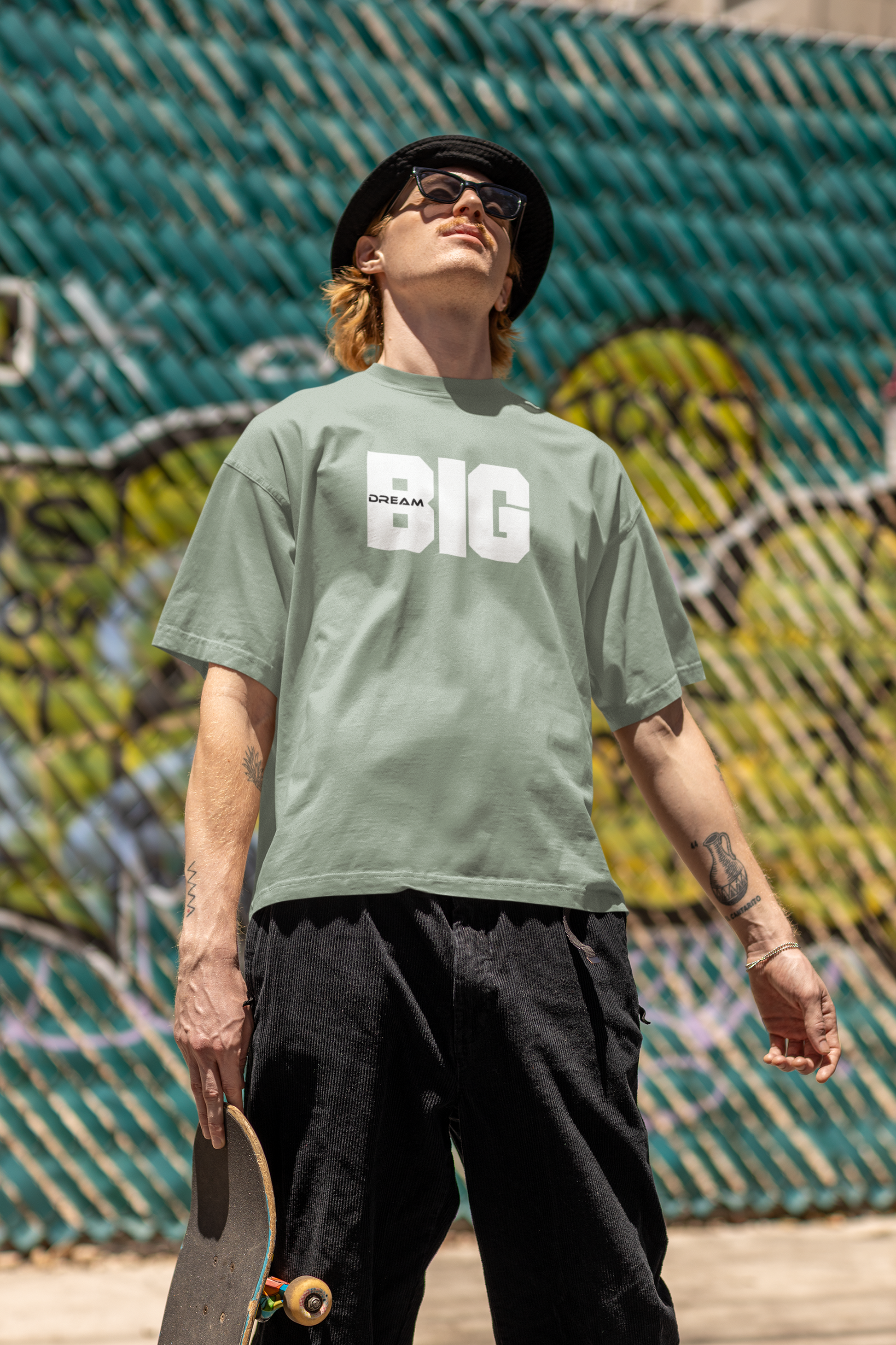 This oversized t-shirt from The Clothie is crafted from 100% premium cotton, ensuring a soft, comfortable fit with a relaxed drape. The front features a bold, graphic print that reads "DREAM BIG" in a clean, impactful font. Perfect for a casual, streetwear look, this tee is designed for those who want to make a statement while enjoying superior comfort and quality. The subtle, dusty green color offers versatility, making it a great addition to any wardrobe.